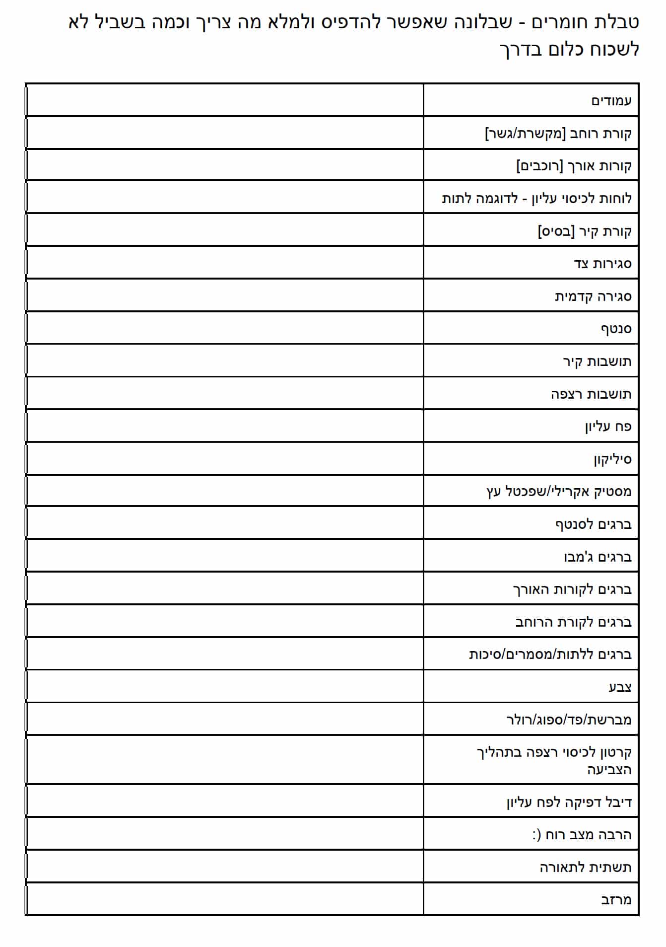 במיוחד לגולשי הפורטל הכנו טבלת חומרים – שבלונה לכל הציוד שצריך על מנת לבנות פרגולה מושלמת ובהמשך נסביר גם איך לחשב בדיוק כמה צריך מכל דבר. מדריך חובה לכל מי שמעוניין לבנות פרגולה בבית ובגינה.